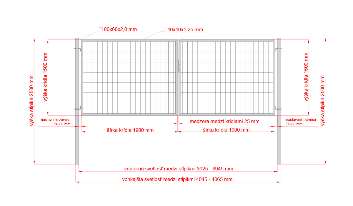 The filling of the goal consists of a welded 2D 5/4/5 panel with a mesh size of 200x50mm. The height of the gate is 1500mm. Width of the gate 4000mm (separate wings of the gate 1900mm). Frame profile 40x40x1,5mm.